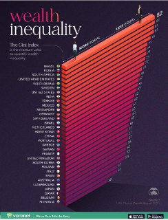 🟢 Ну, в общем, печально, конечно. Хотя как считать... и что считать. И еще интересно, как такое неравенство соотносится с концепцией устойчивого развития, рейтингами и индексами ESG, ЭКГ и Общественного капитала. Интересно было бы сопоставить одно с другим и третьим... Но некогда, если честно. Эта визуализация сравнивает страны по уровню неравенства в сфере благосостояния в 2024 году с использованием коэффициента Джини — стандартного показателя, где 0 представляет идеальное равенство, а 1 — максимальное неравенство. Данные для этого графика взяты из отчета UBS Global Wealth Report 2025, в котором анализируются уровни благосостояния и его распределение на более чем 50 рынках. Бразилия, Россия и Южная Африка возглавляют список по уровню неравенства благосостояния: в каждой из этих стран коэффициент Джини составляет около 0,8. Эти оценки указывают на высокую концентрацию активов относительно остального населения. #Данные 🔰 Подробнее тут. 👒 Подписаться на телеграм-канал Светланы Бик 100%_Зеленого @greenpercent