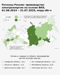 По абсолютным объёмам ВИЭ-генерации пятёрку лидеров составили регионы Поволжья и Сибири с мощной гидроэнергетикой: в Волгоградской области это Волжская ГЭС, в Амурской — Бурейская, Нижне-Бурейская и Зейская ГЭС, а в первую тройку вошли регионы Восточной Сибири с самыми большими гидроэлектростанциями страны — Саяно-Шушенской (Хакасия), Красноярской (Красноярский край), Братской и Усть-Илимской (Иркутская область).