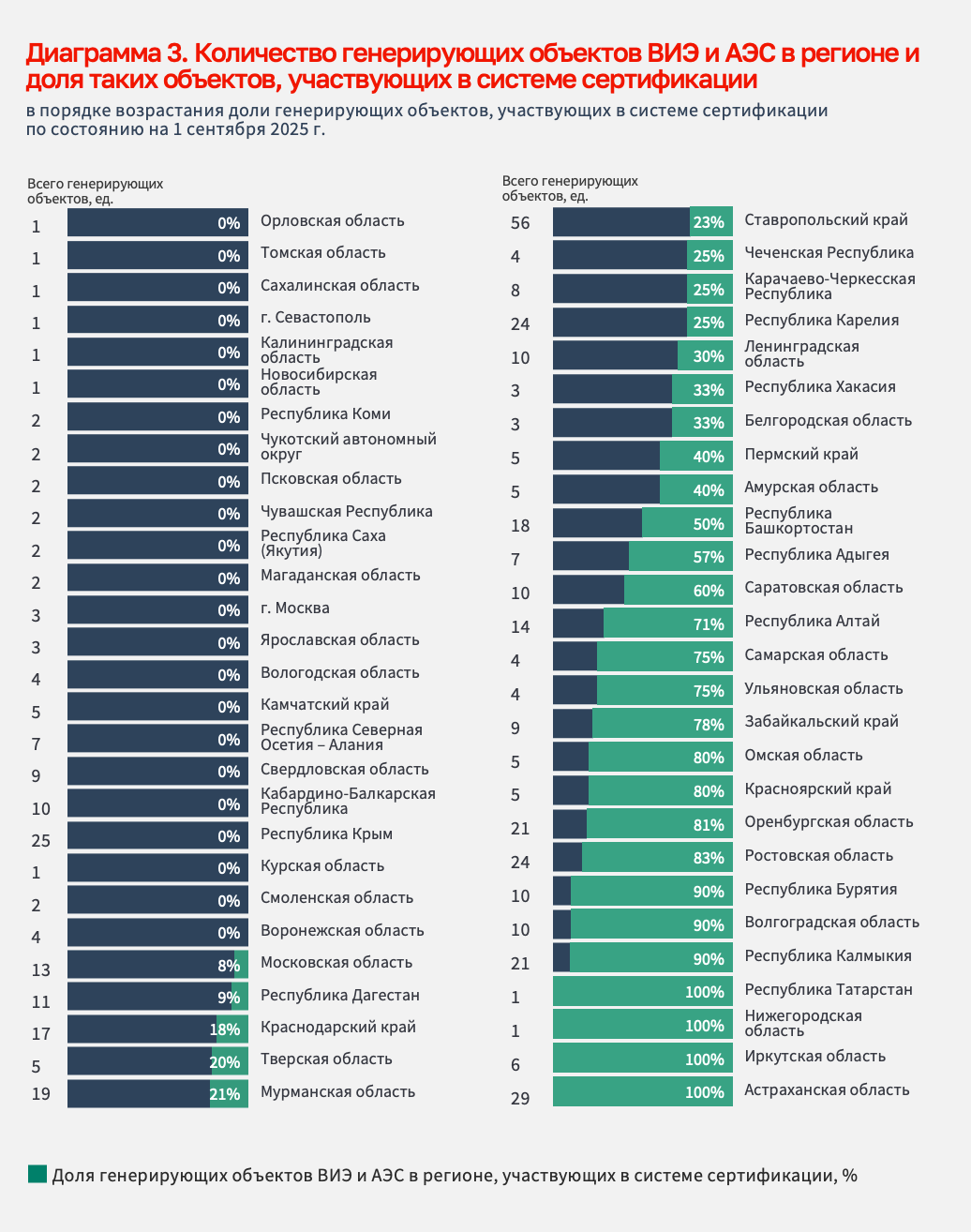Если в большинстве регионов доля чистой генерации отражает структуру электроэнергетики, унаследованную от тех времён, когда задача развития чистой генерации не ставилась, то такой показатель, как доля генерирующих объектов ВИЭ и АЭС, участвующих в системе сертификации, напротив, характеризует целенаправленные действия владельцев, добровольно выводящих свои электростанции на рынок чистой электроэнергии.