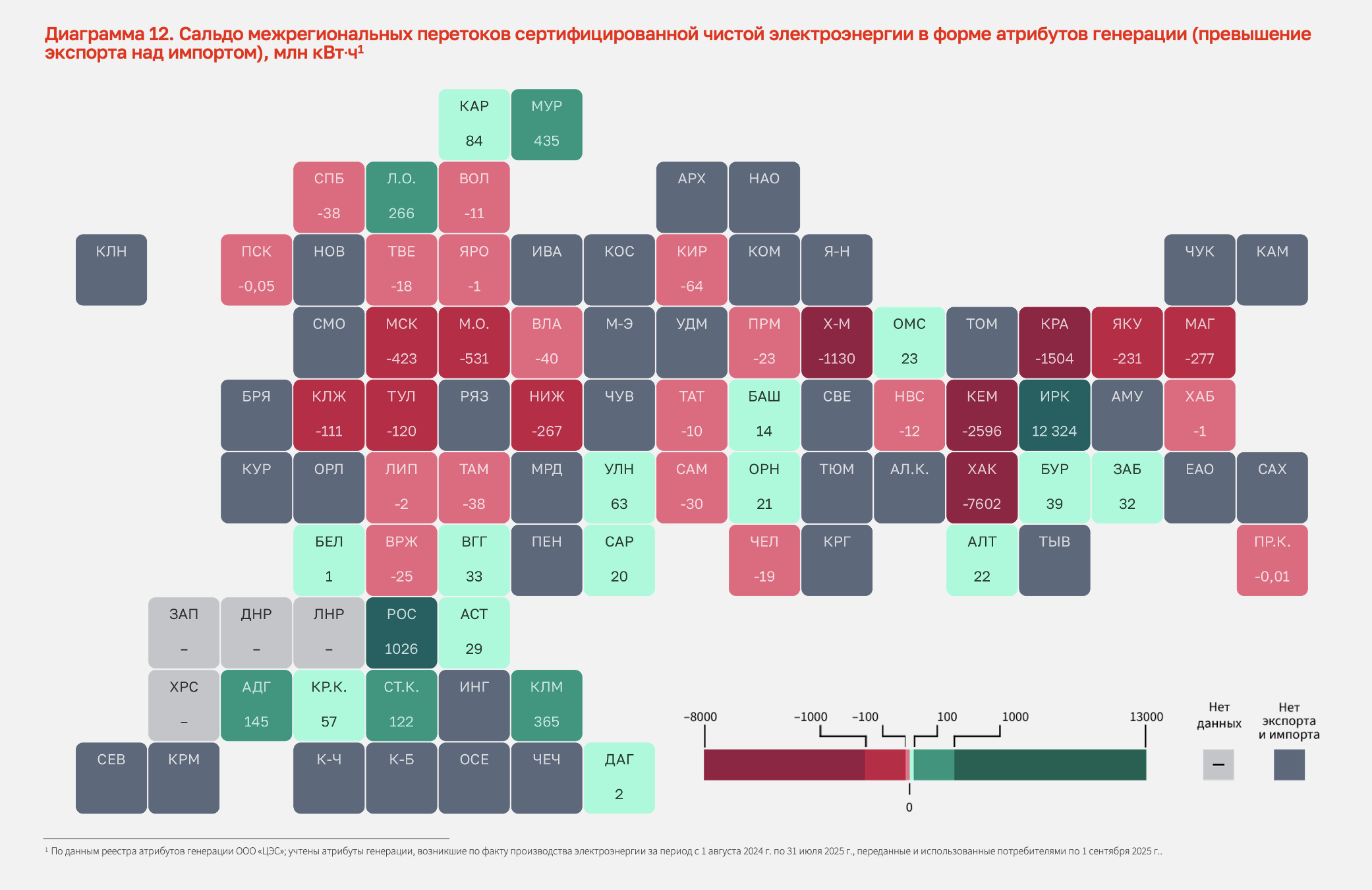 7 В объёмы потребления, экспорта и импорта чистой электроэнергии были включены объёмы приобретённых атрибутов генерации, записи об использовании которых потребителями были внесены в реестр атрибутов генерации в период с 13 сентября 2024 г. (день, когда были учтены атрибуты генерации, возникшие по факту производства электроэнергии в августе 2024 г.) по 1 сентября 2025 г. Следует иметь в виду, что указанные объёмы не являются окончательными и изменятся в сторону увеличения, так как к 1 сентября 2025 г. были переданы и использованы ещё далеко не все атрибуты генерации, возникшие по факту производства электроэнергии за январь — июль 2025 года. Кроме того, в реестре будут учтены возникновение и использование новых атрибутов генерации, соответствующих выработке за август — декабрь 2025 года.