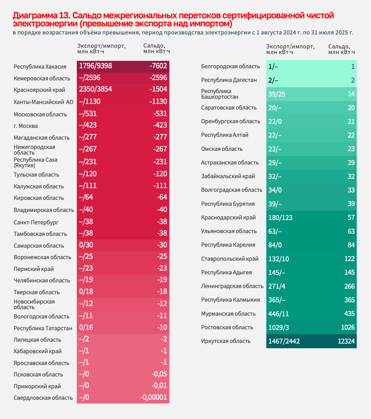 Показатель приобретает положительное значение, если регион является нетто-экспортёром, и отрицательное, если импорт превышает экспорт. Данные приведены на Диаграмме 13, при этом регионы, которые в рассматриваемый период (13 сентября 2024 г. — 1 сентября 2025 г.) не экспортировали и не импортировали чистую электроэнергию, не представлены.