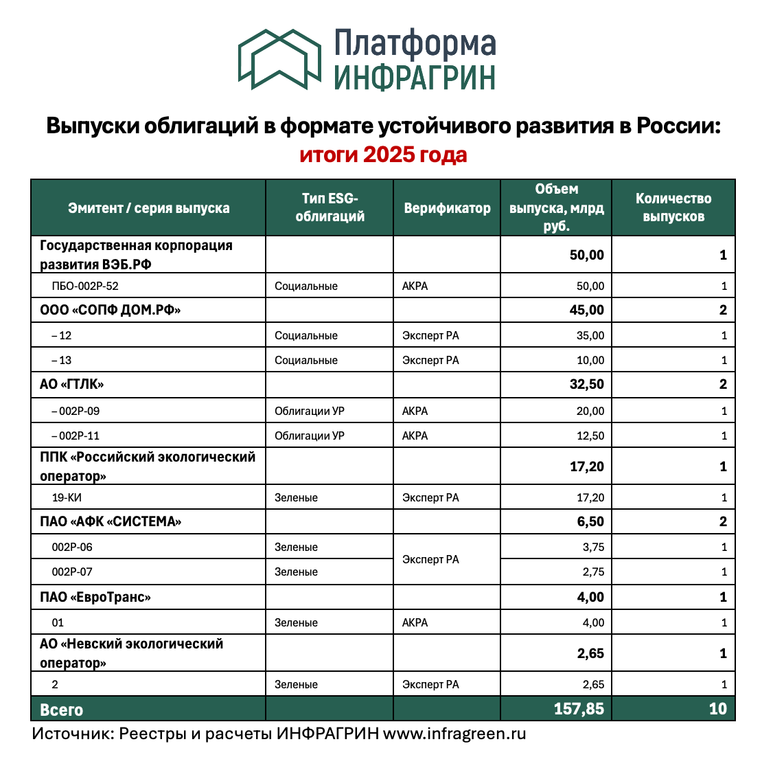 В 2025 году 7 российских эмитентов осуществили 10 выпусков облигаций в формате устойчивого развития суммарным объёмом 157,85 млрд руб., что: