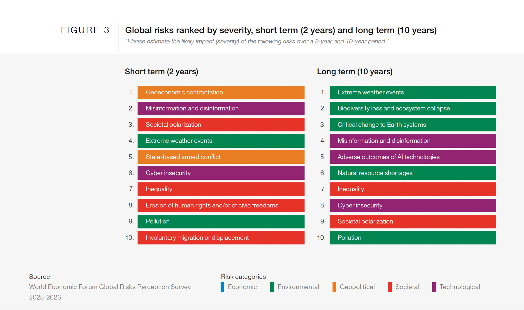 Риски в докладе распределены по пяти устойчивым категориям: экономические, экологические, геополитические, социальные и технологические. Климатические угрозы — экстремальные погодные явления, критические изменения земных систем, дефицит природных ресурсов — входят в экологическую категорию, но не выделяются отдельно. Такая классификация применяется ВЭФ на протяжении всей истории доклада.