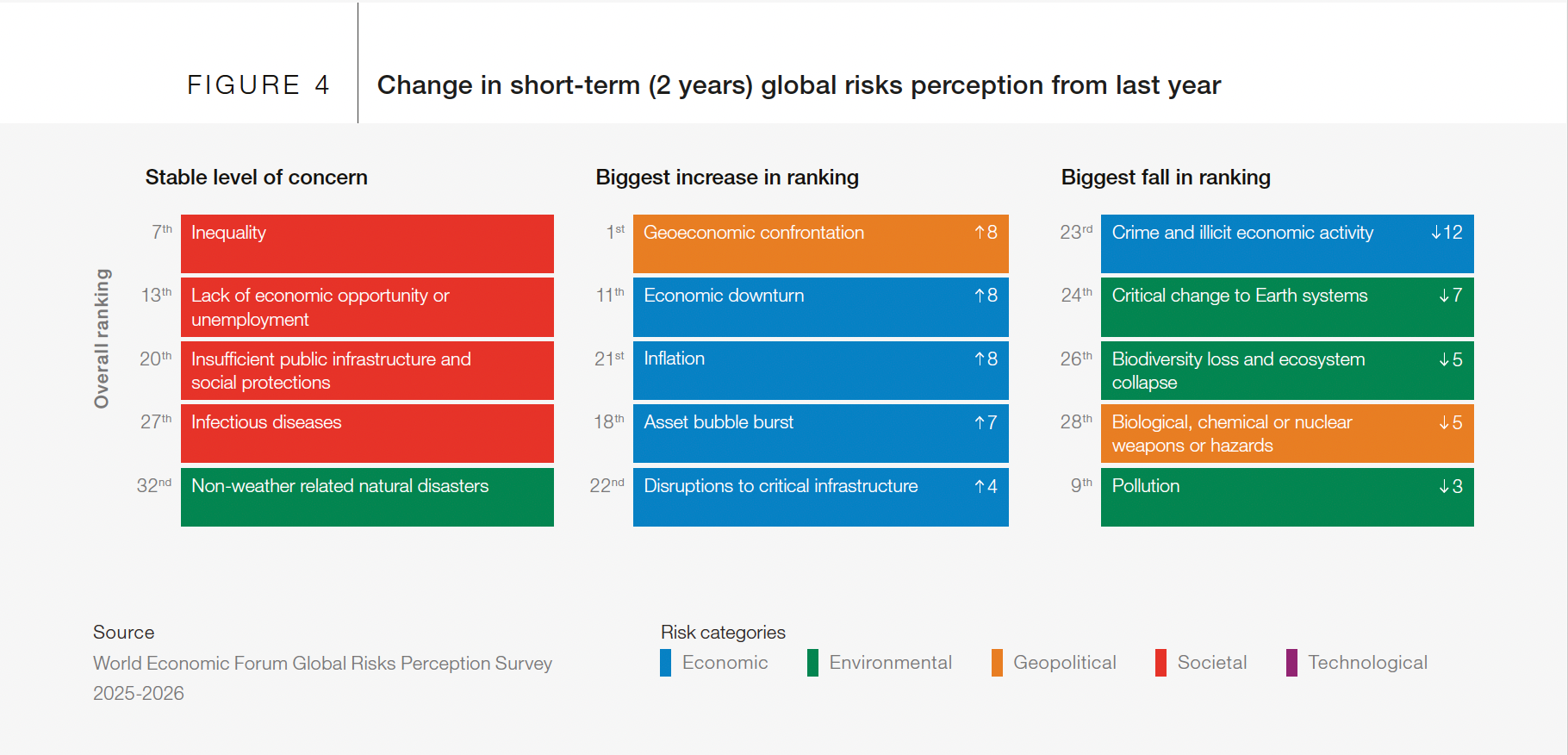 Экономическая категория продемонстрировала наиболее выраженную динамику по сравнению с прошлогодним докладом. Экономический спад и инфляция поднялись на восемь позиций каждый, схлопывание пузырей активов — на семь. Ни одна другая категория рисков не показала сопоставимого совокупного роста.