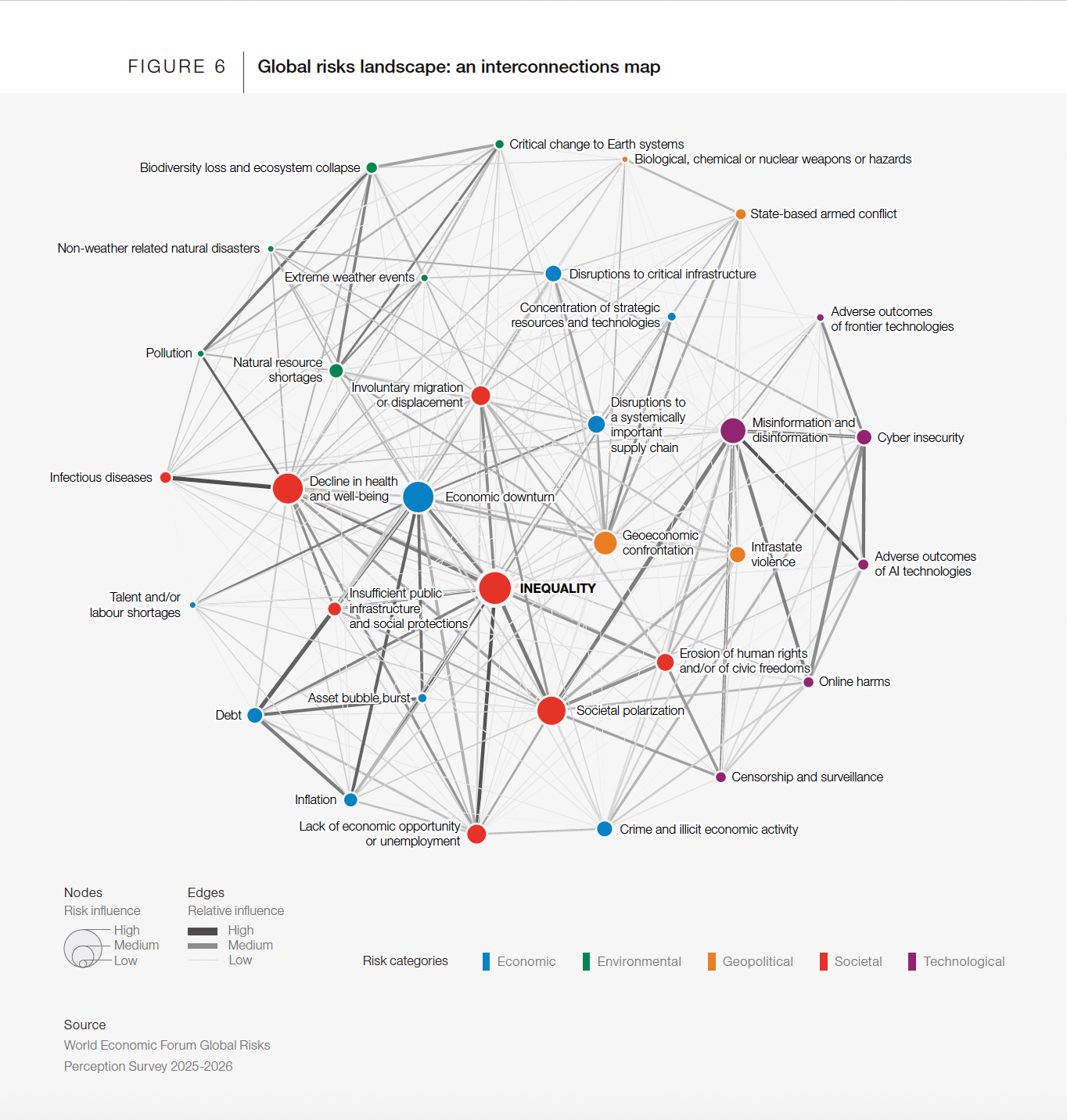 Второй год подряд неравенство признается наиболее взаимосвязанным риском в глобальной системе. Методология доклада предполагает анализ связей между рисками: респондентов просили указать, какие угрозы с наибольшей вероятностью будут спровоцированы каждым из рисков. Неравенство оказалось в центре этой сети, выступая одновременно следствием и катализатором множества других угроз.