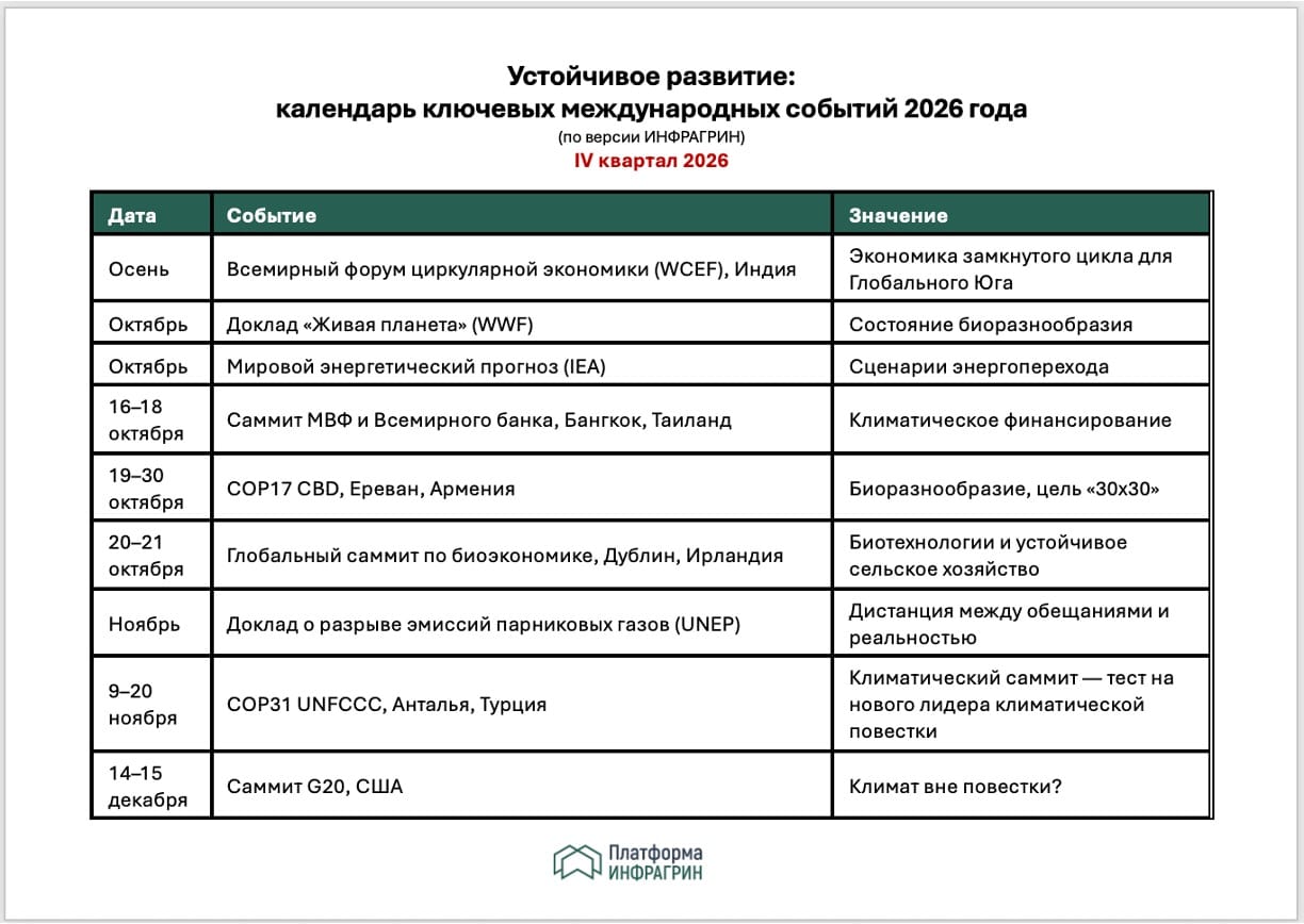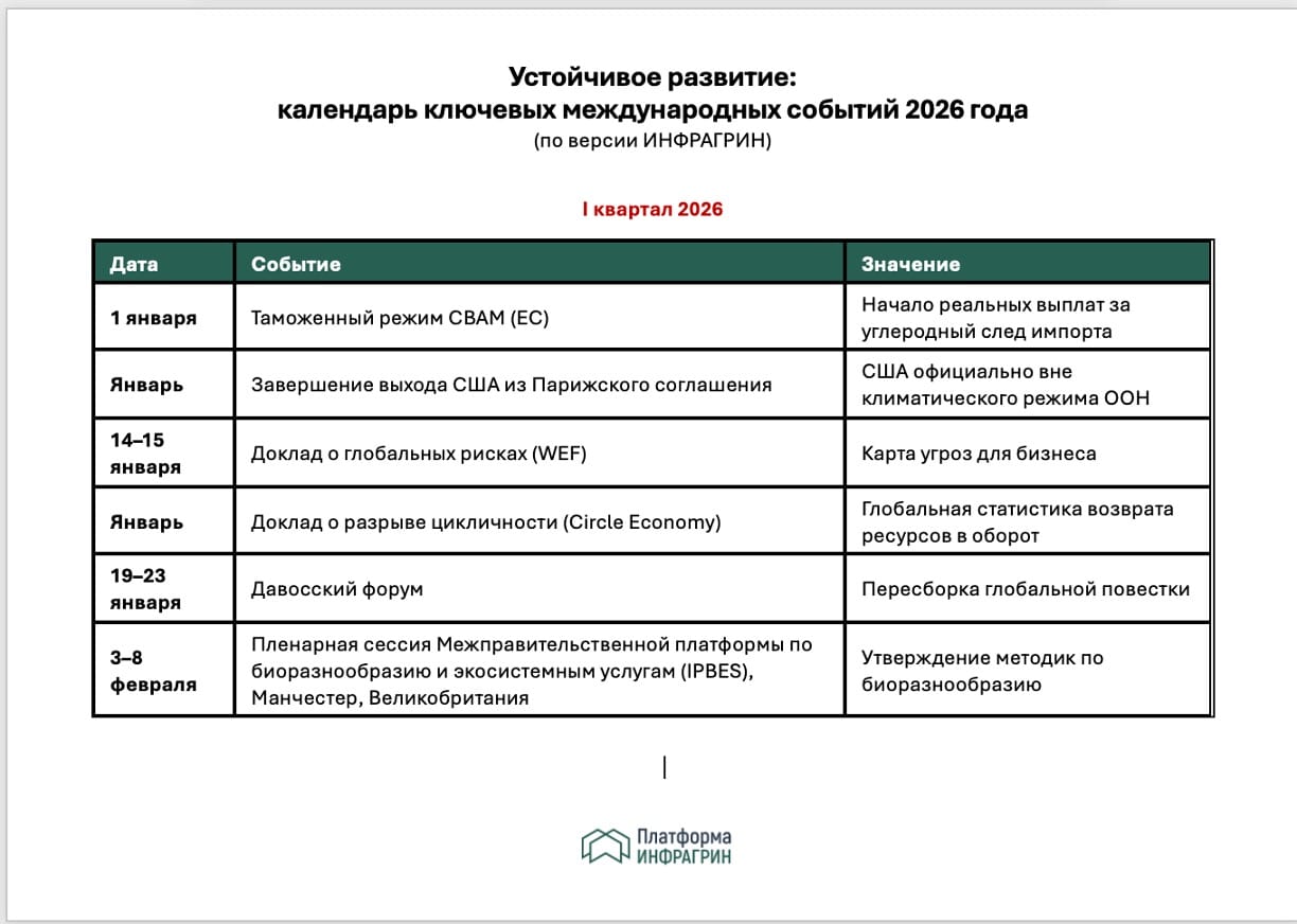 ИНФРАГРИН в 2026 году продолжит отслеживать динамику регуляторных требований в ключевых юрисдикциях, практику применения CBAM и ее последствия для российских экспортеров, развитие отраслевых стандартов, ход евразийских конференций ООН и формирование новых центров влияния в глобальной повестке устойчивого развития. Отдельное внимание — темам экономики замкнутого цикла и природного капитала, которые развиваются относительно независимо от климатической турбулентности и политических пристрастий, но при этом формируют новые вектора позитивного развития.