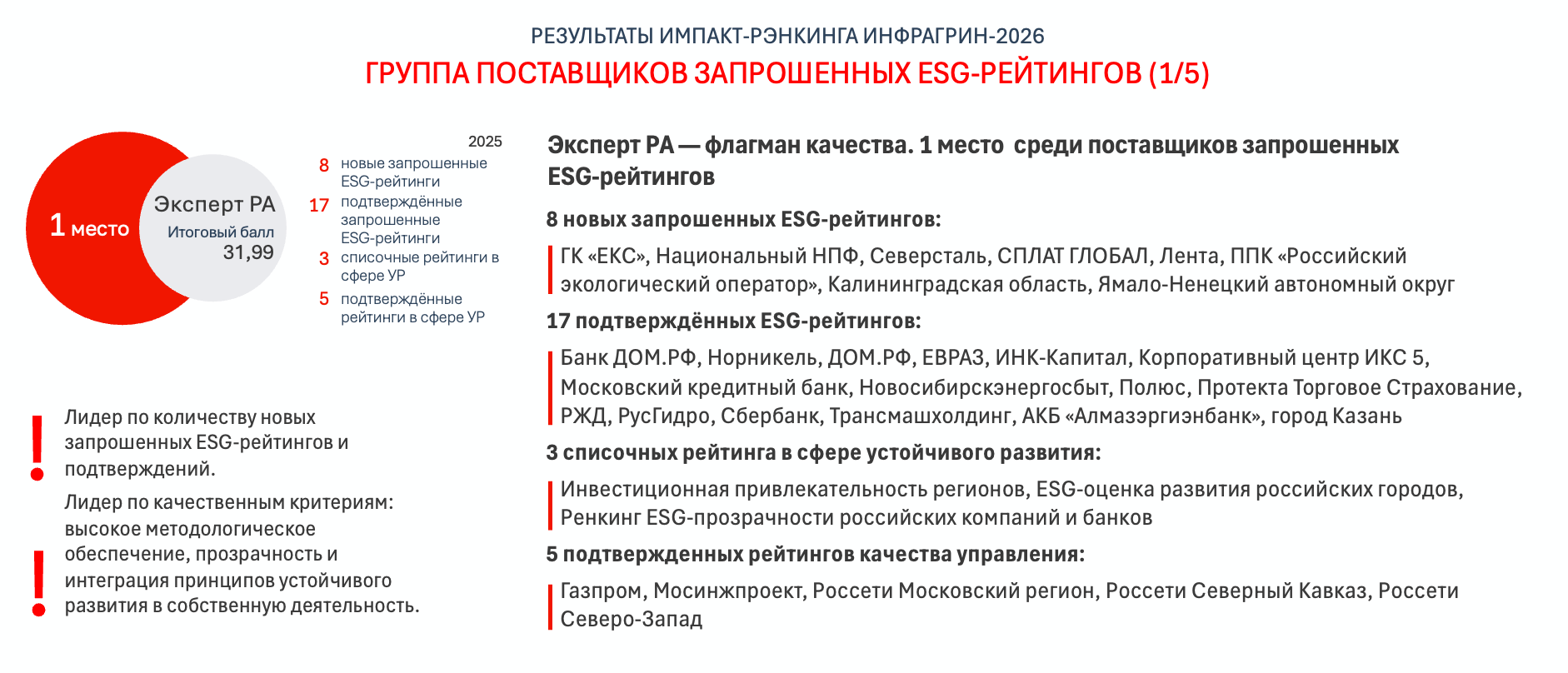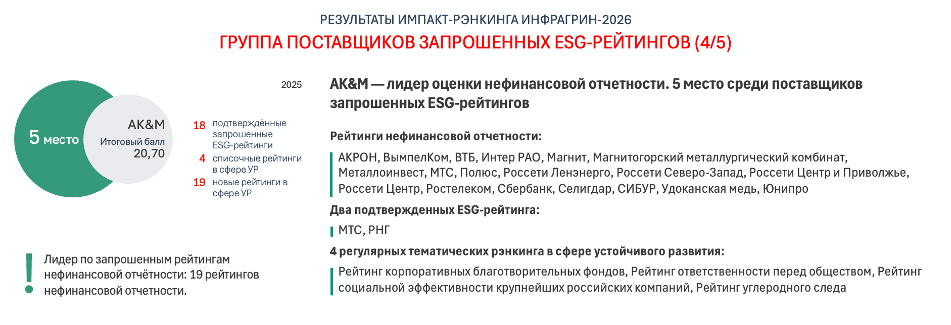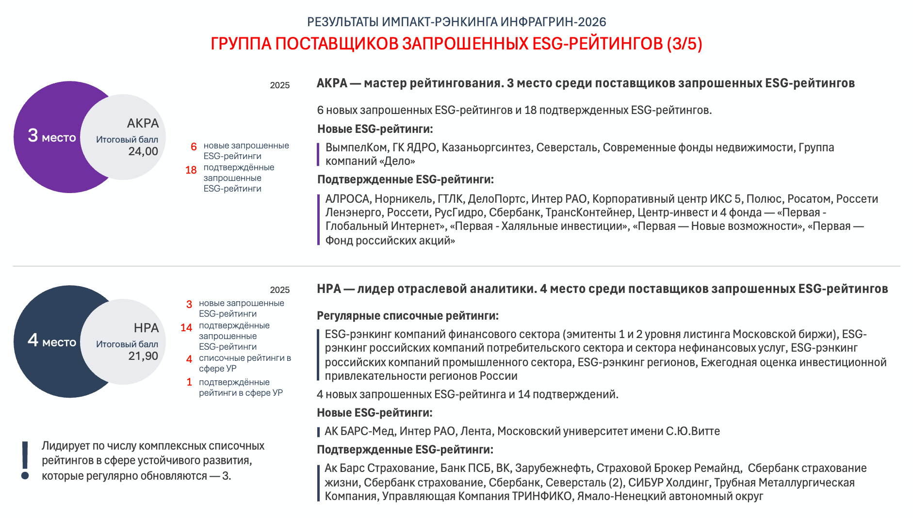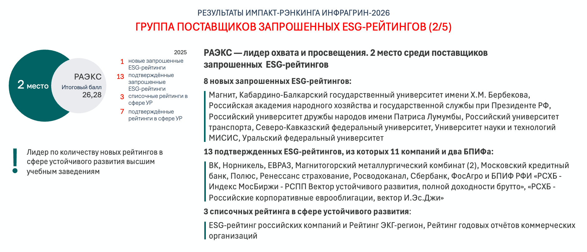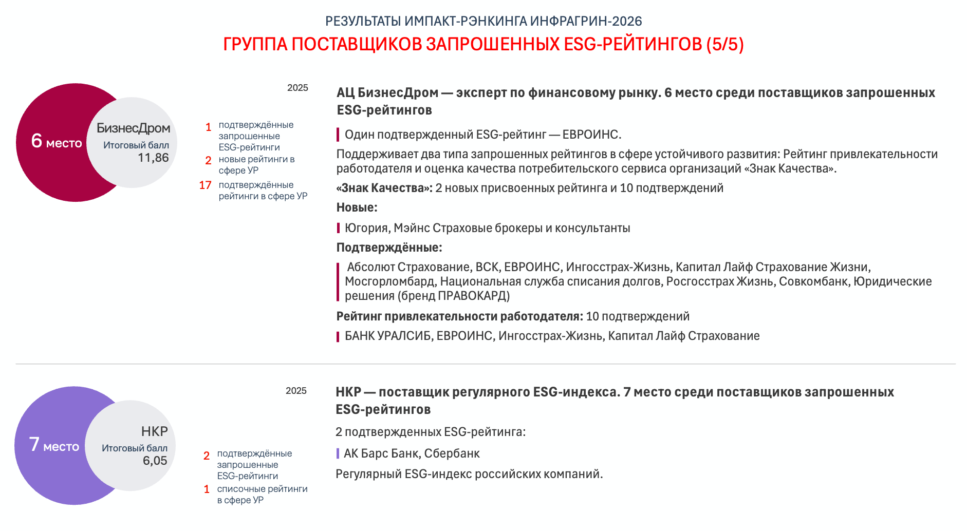 Группа поставщиков запрошенных ESG-рейтингов включает 7 организаций: АКРА, АЦ БизнесДром, НКР, НРА, РАЭКС, Эксперт РА и AK&M. Все организации показали результаты в 2025 году и включены в Импакт-рэнкинг.