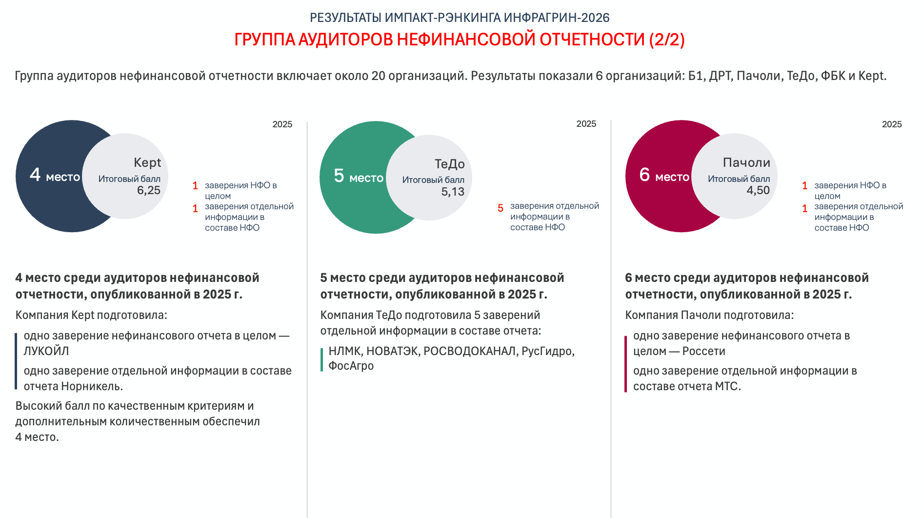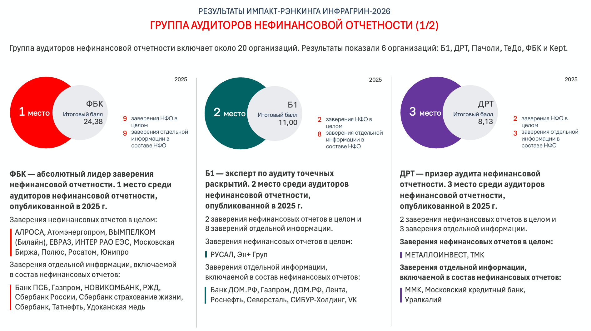 Группа аудиторов нефинансовой отчетности включает около 20 организаций. Результаты показали 6 организаций: Б1, ДРТ, Пачоли, ТеДо, ФБК и Kept.