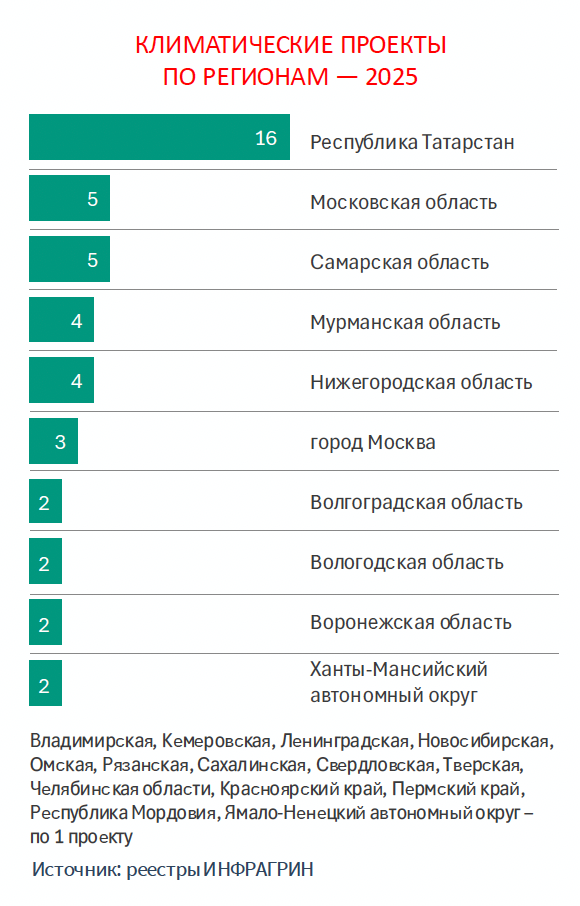 Добровольный рынок развивался в собственном темпе. В 2025 году зарегистрированы 42 новых климатических проекта в 24 регионах. Реестр перешагнул отметку в 90 проектов, объем планируемых углеродных единиц впервые превысил 100 млн.