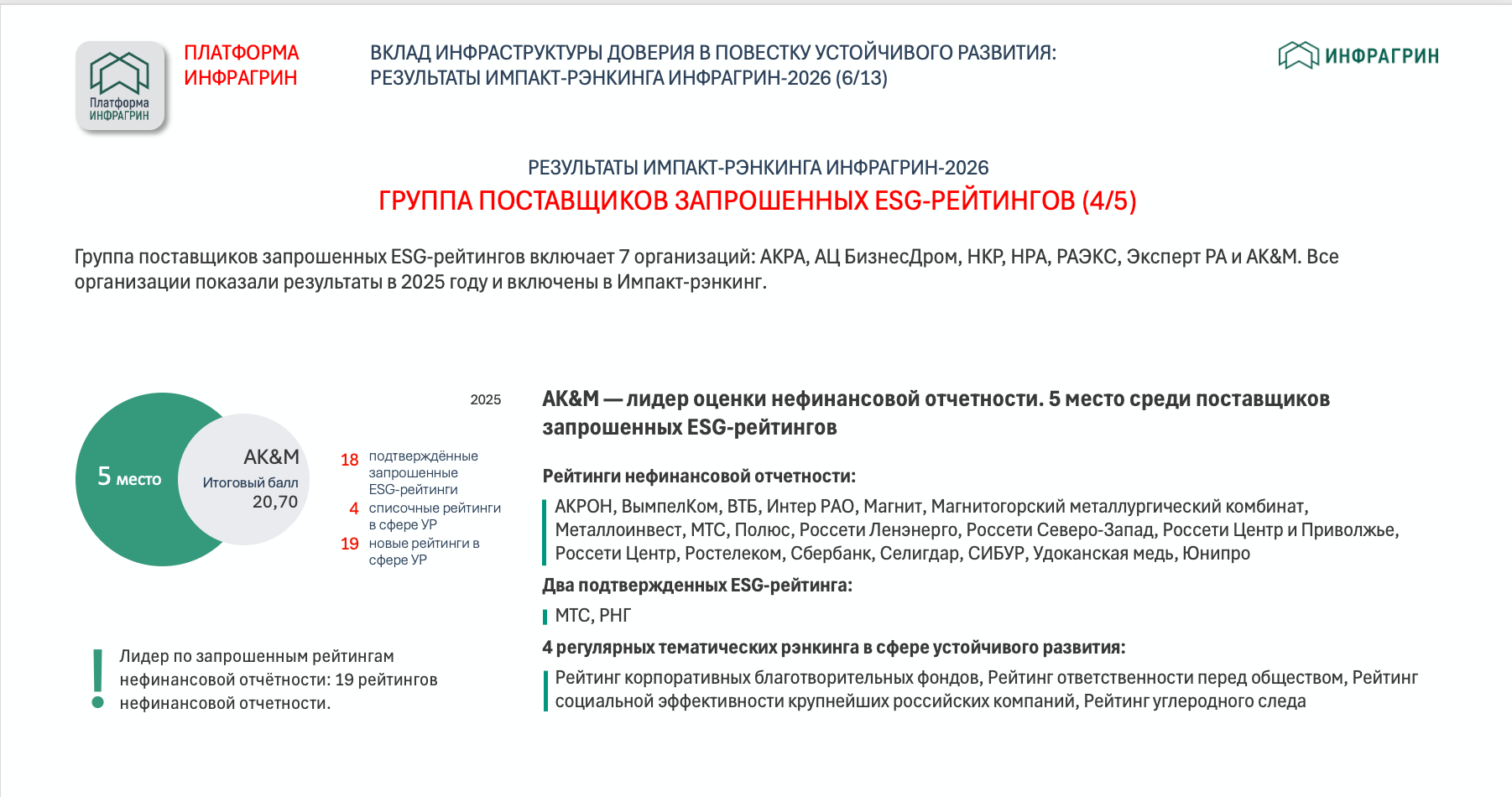 Информационное агентство АК&М традиционно оказывает информационную поддержку докладу, а одноименное рейтинговое агентство входит в Импакт-рэнкинг ИНФРАГРИН как участник инфраструктуры доверия российского рынка устойчивого развития. По итогам 2025 года агентство занимает пятое место в группе поставщиков запрошенных ESG-рейтингов и лидирует по числу рейтингов нефинансовой отчётности — 19 за год. Это измеримый вклад в формирование стандартов раскрытия, без которых повестка устойчивого развития остаётся декларативной — и именно такая аудитория раньше других получает информацию о данных доклада ИНФРАГРИН через информационные каналы АК&М.