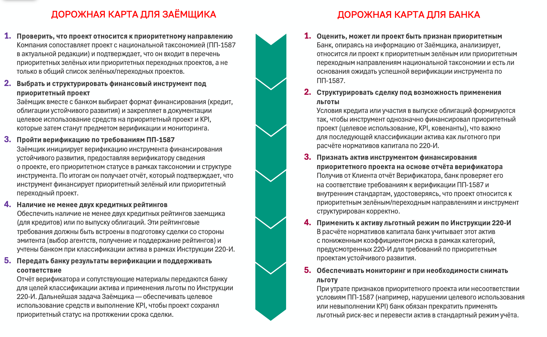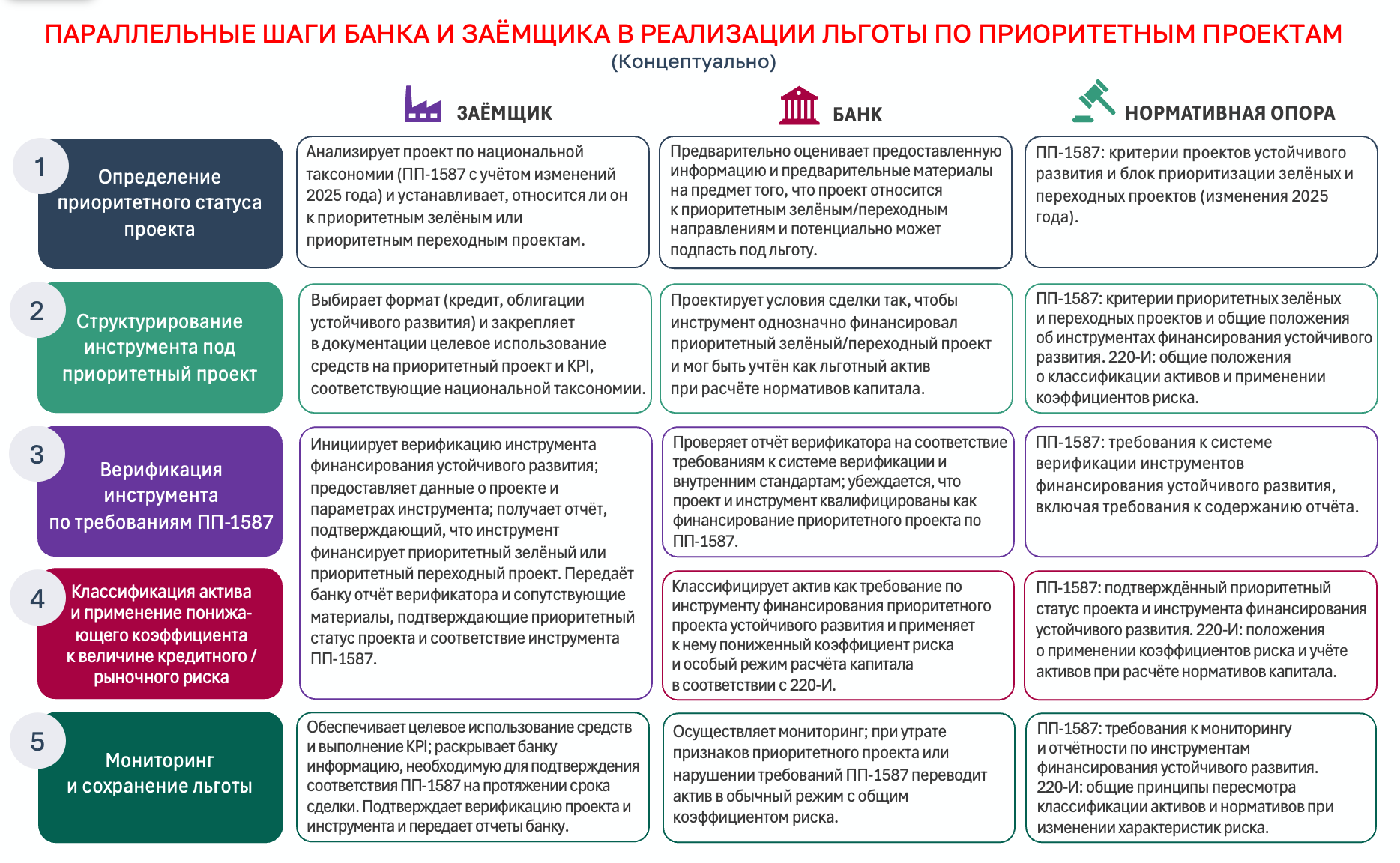 В центре конструкции по реализации льготы — согласованные действия Банка и Заёмщика в рамках трёх блоков: национальной таксономии (ПП‑1587), требований к верификации (ПП‑1587) и Инструкции ЦБ 220‑И.