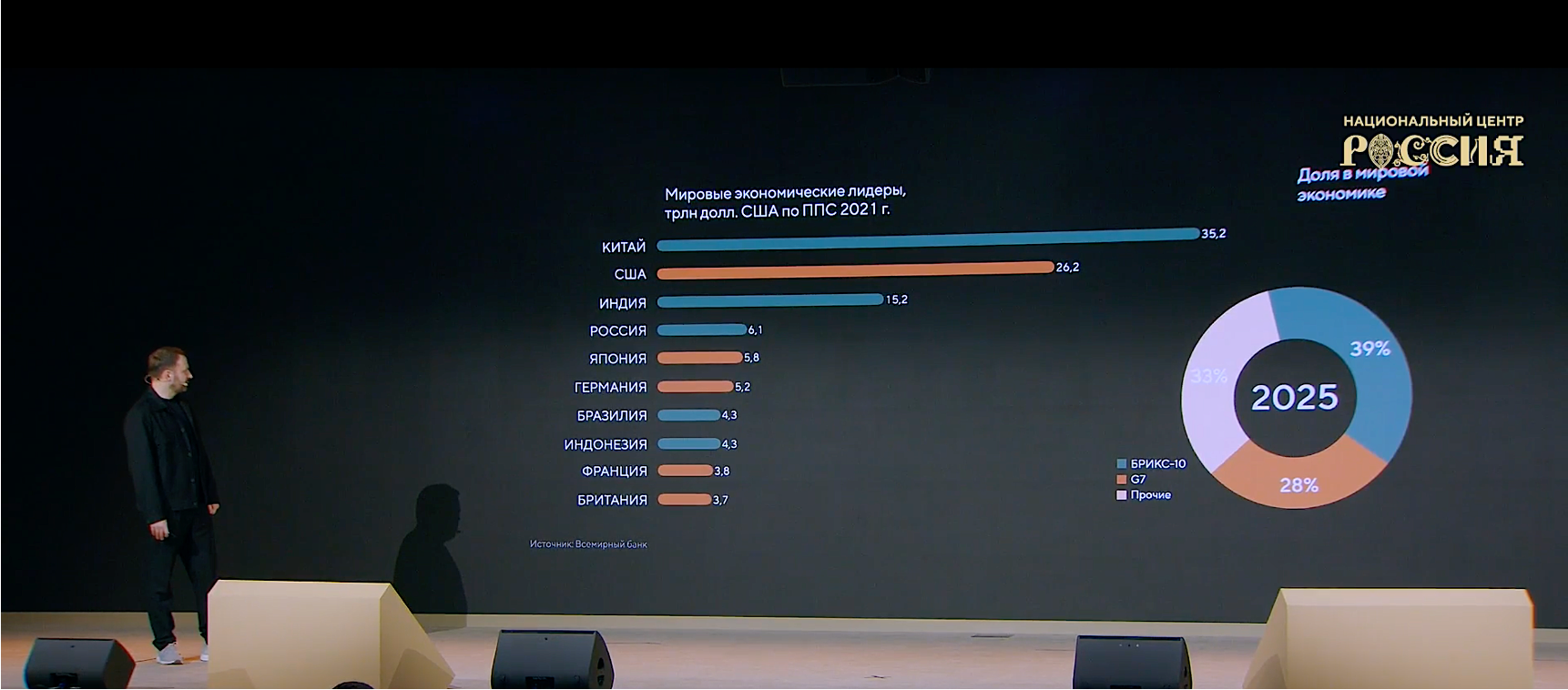 Заместитель руководителя Администрации Президента в самом начале выступления обратил внимание на радикальное изменение геополитической карты и структуры мировой экономики. В 1980 году доля стран Большой семерки составляла 45% глобального ВВП, а первая пятерка крупнейших экономик целиком состояла из их представителей.