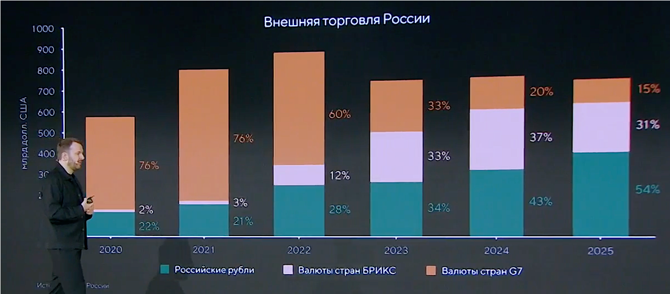 В качестве иллюстрации эксперт привел данные по внешней торговле России. В 2021 году более трех четвертей внешнеэкономического оборота страны обслуживалось в валютах G7; по итогам 2025 года 85% торговли проводится в рублях или валютах стран БРИКС. Спикер расценил этот кейс как опережающее проявление тенденции, которая в той или иной мере затронет всю глобальную экономику.