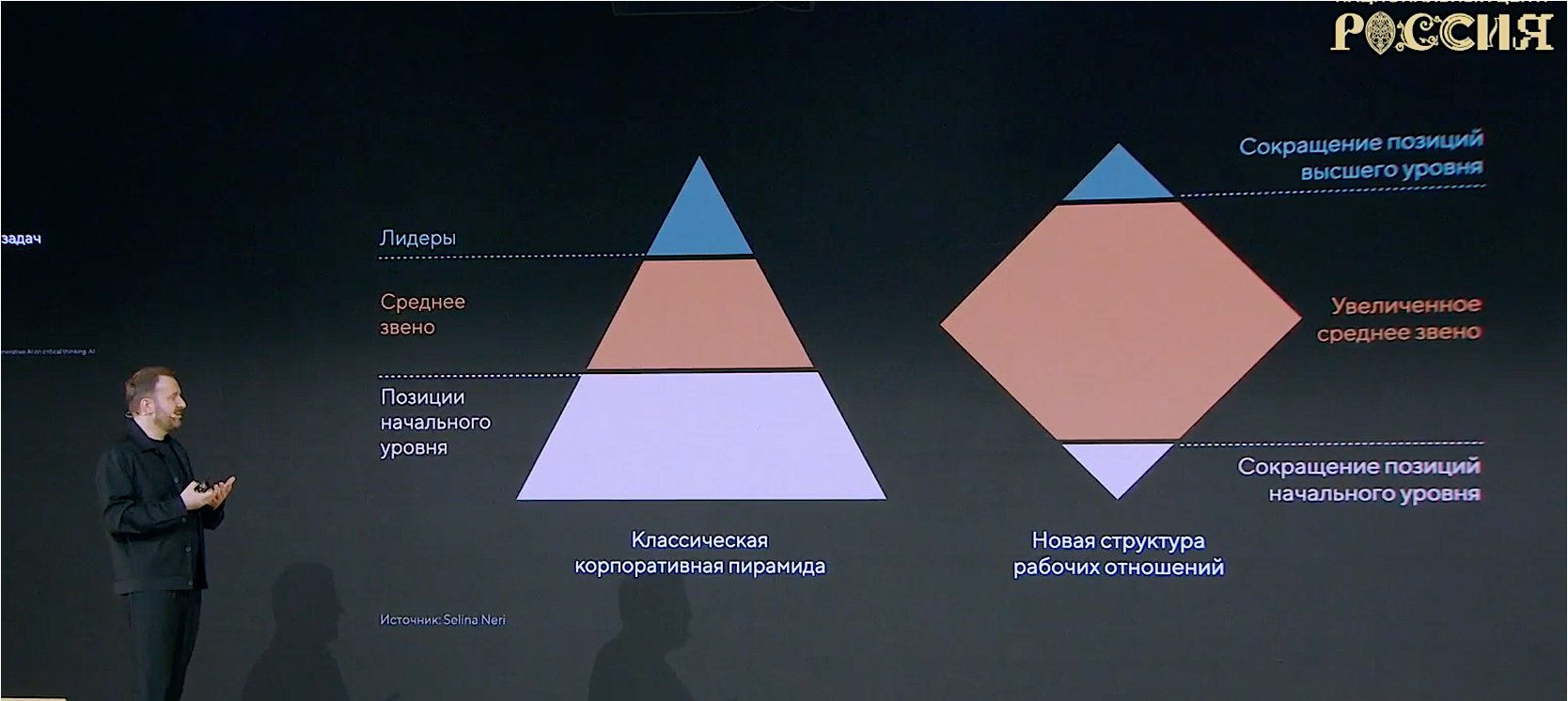 Пользуясь схемой, представленной на конференции, выступающий описал механизм вытеснения: ИИ начинает «подъедать» кадровую пирамиду снизу, делая позиции начального уровня избыточными. Без стартовых позиций разрывается традиционная цепочка профессионального роста — и это, по его словам, ставит принципиальный вопрос перед системой образования: она должна выдавать уже специалистов среднего уровня, способных работать в связке с ИИ.