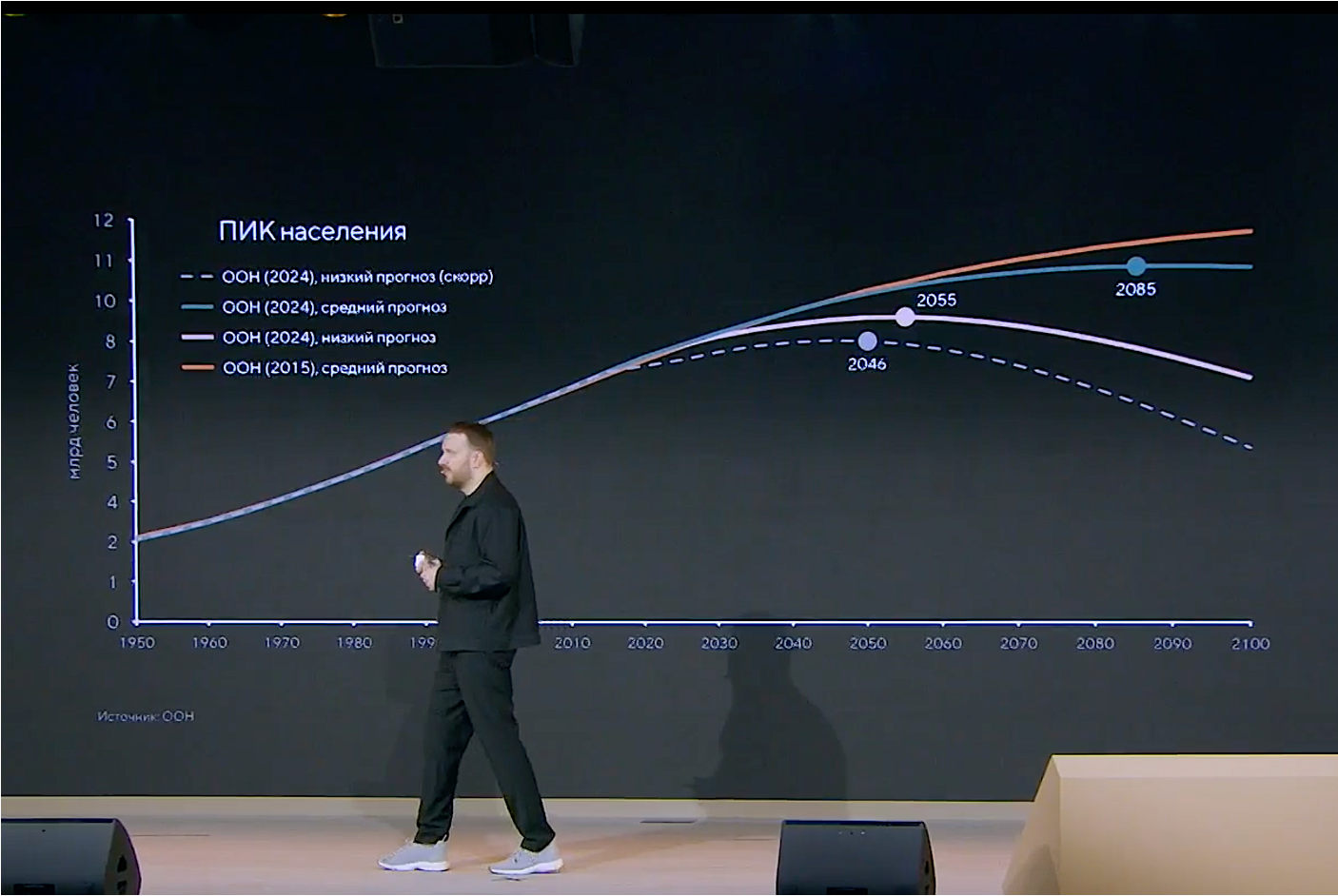 Суммарный коэффициент рождаемости в мире опустился ниже уровня воспроизводства. Все предпосылки для перехода к снижению численности населения уже заложены. Прогноз ООН 2024 года определяет пик в 2085 году (при низком варианте — в 2055-м), однако, по оценке выступающего, если экстраполировать устойчивые тренды и данные 2025 года, пик наступит скорее около 2046 года. Одновременно около 2033 года минимального значения достигнет демографическая нагрузка (соотношение детей и пожилых к трудоспособному населению), после чего она начнет быстро расти — уже не за счет сокращения детей, а за счет роста доли пожилых.