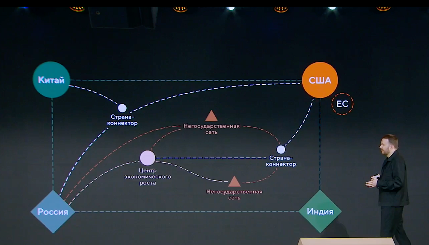 Описывая новую архитектуру мирового порядка, Максим Орешкин выделил четыре полюса суверенитета — США, Китай, Россию и Индию — и особо остановился на понятии суверенитета как такового, разделив его на три уровня: государственный (быть или не быть), общественный (каким быть — через ценности и культурный код) и экономический (как быть — через создание и удовлетворение потребностей). По его словам, подлинный суверенитет достигается только при наличии всех трех составляющих одновременно, причем ни одна страна не может быть полностью суверенной в изоляции — суверенитет предполагает активное взаимодействие с партнерами.