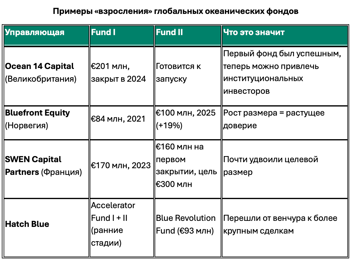 Британская Ocean 14 Capital закрыла первый фонд на €201 млн и готовит вторую стратегию, норвежская Bluefront Equity привлекла €100 млн во второй фонд (против €84 млн в первом), французская SWEN Capital Partners собрала €160 млн на первое закрытие своего второго океанического фонда. Институциональные инвесторы пока осторожны: отсутствие трэк-рекорда у темы в целом, высокие воспринимаемые риски и фокус на развивающихся рынках отпугивают пенсионные фонды.