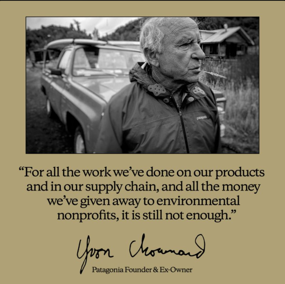 А 87-летний основатель добавил в предисловии: "Прибыль никогда не была целью для Patagonia", но усилия до сих пор "недостаточны". Он предсказывает трудные годы впереди, частично из-за цинизма коллег по бизнесу, но подчёркивает: "Страх ошибиться не может остановить нас от попытки сделать правильно".