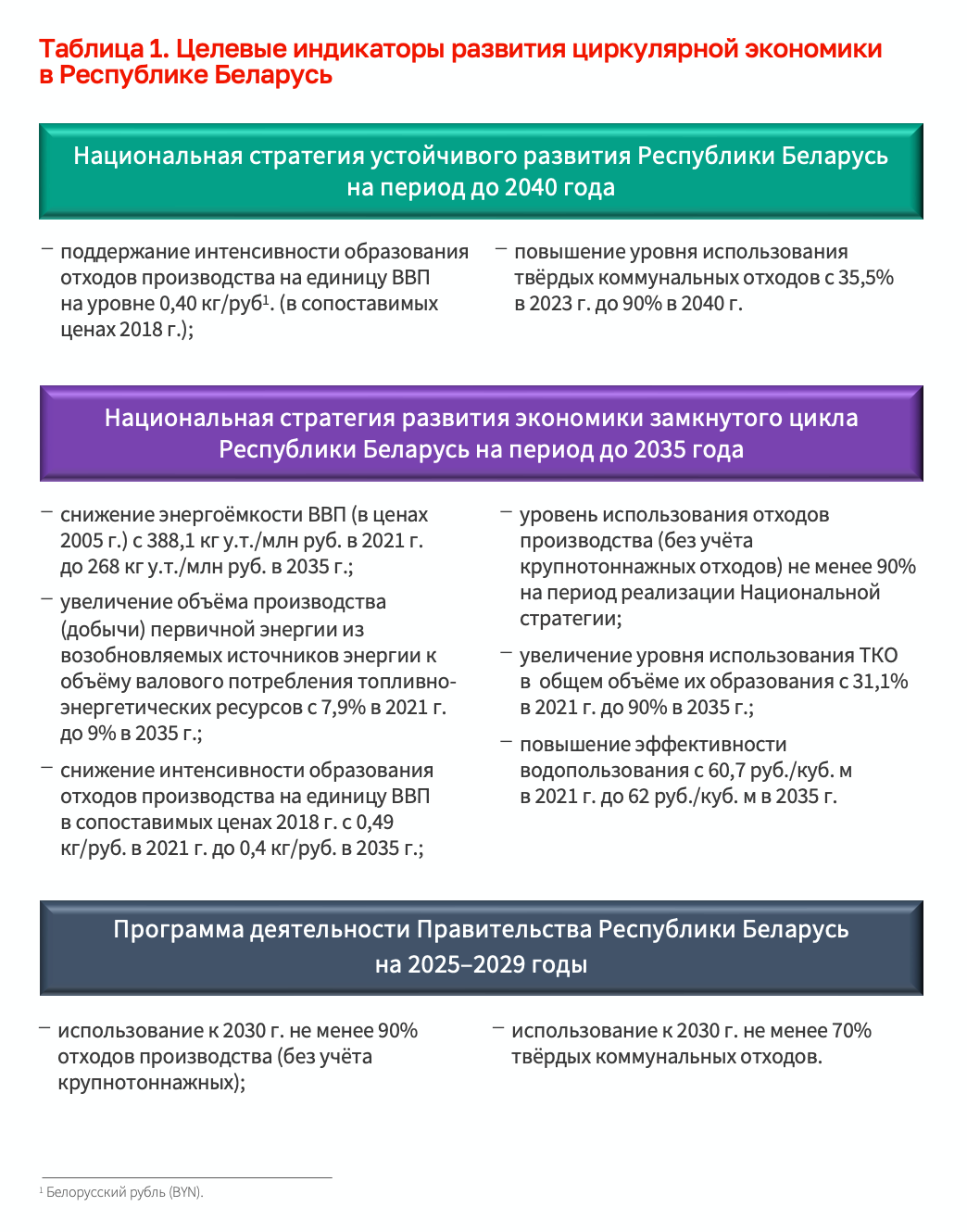 В качестве главной стратегической цели развития циркулярной экономики в Беларуси определено обеспечение перехода к рациональным моделям производства и потребления, максимальное вовлечение образующихся отходов в хозяйственный оборот в качестве вторичного сырья (Национальная стратегия устойчивого развития Республики Беларусь до 2040 года).
