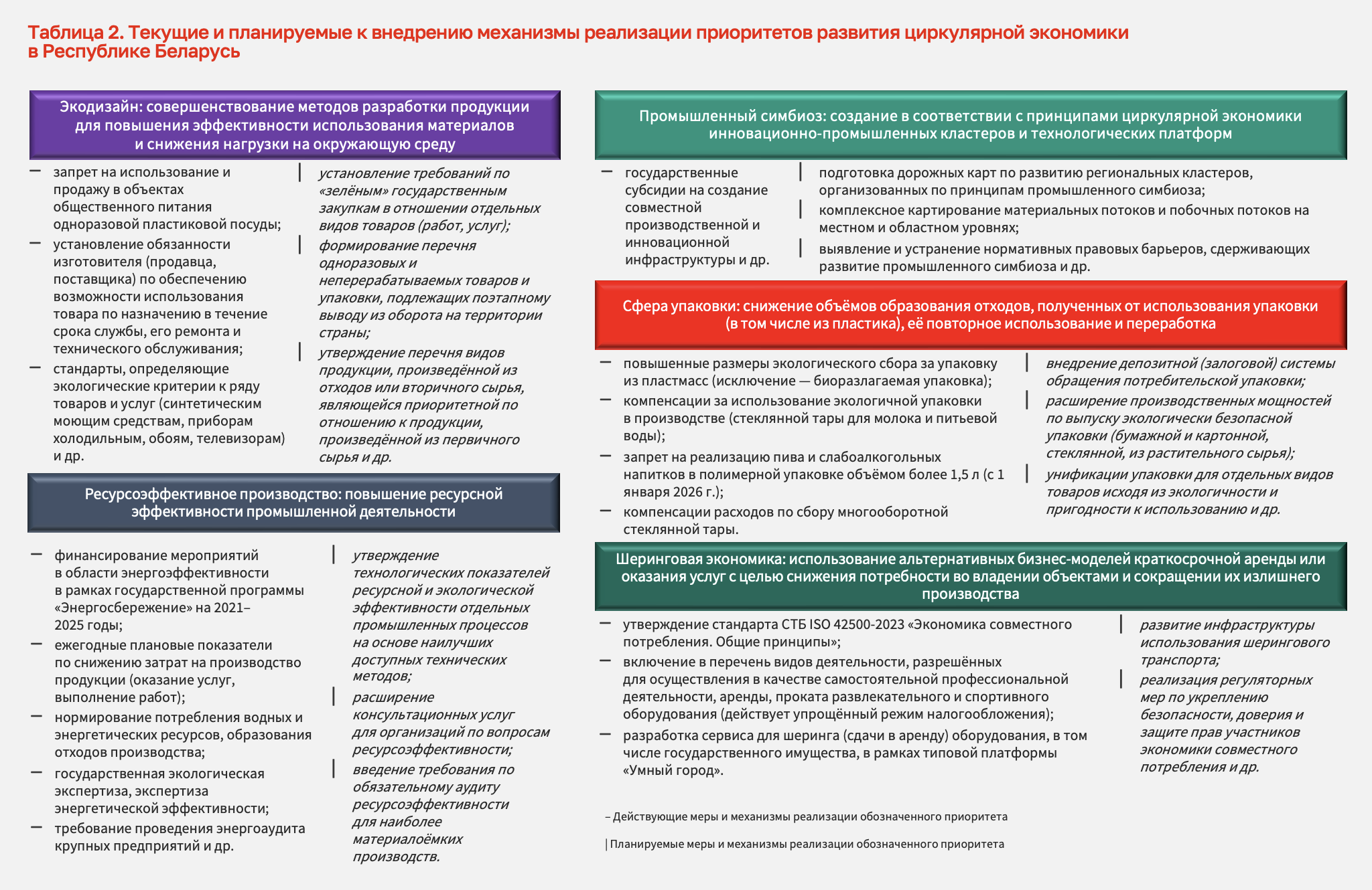 Национальной стратегией развития экономики замкнутого цикла (циркулярной экономики) Республики Беларусь на период до 2035 года, принятой в мае 2024 года, определены пять приоритетных направлений развития циркулярной экономики в стране: экодизайн, ресурсоэффективное производство, промышленный симбиоз, сфера упаковки и шеринговая экономика. Инструментарий их реализации, используемый в настоящее время и в перспективе, представлен в Таблице 2.