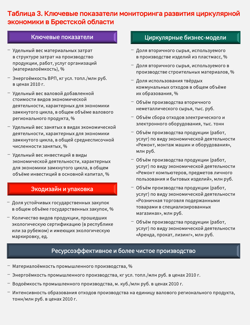 Для оценки прогресса в формировании экономики замкнутого цикла в Брестской области используется следующий перечень показателей (Таблица 3), в основу которого была положена рамочная система мониторинга развития экономики замкнутого цикла в Европейском союзе5.