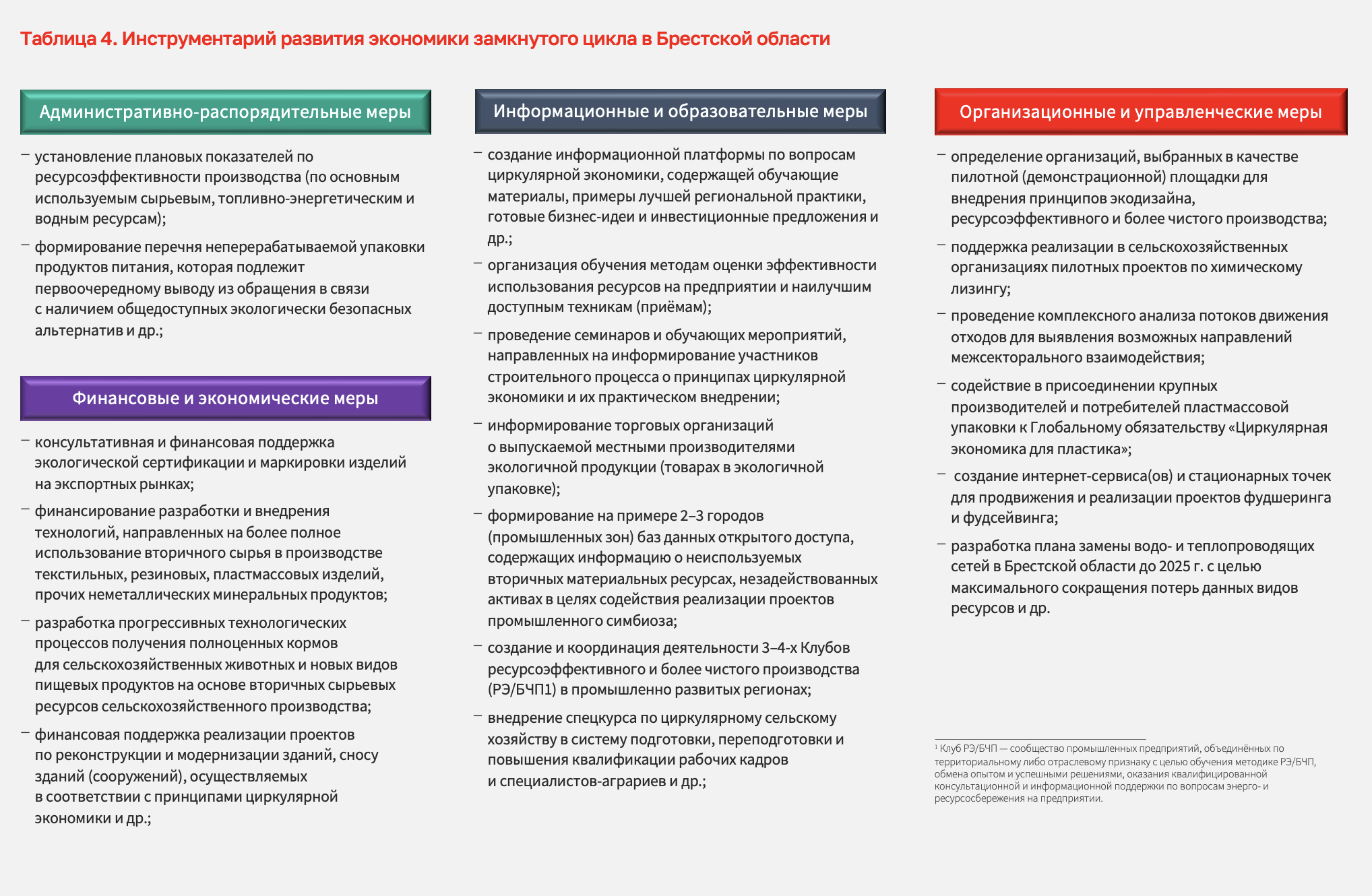 В комплекс первоочередных мер по развитию циркулярной экономики в Брестской области в 2021–2025 годах вошли 56 мероприятий, сгруппированных по 4 ключевым направлениям (экодизайн, ресурсоэффективное и более чистое производство, бизнес-модели циркулярной экономики, промышленный симбиоз) и 7 секторам (промышленность, строительство, транспорт, торговля и общественное питание, жилищно-коммунальное хозяйство, сельское и лесное хозяйство).