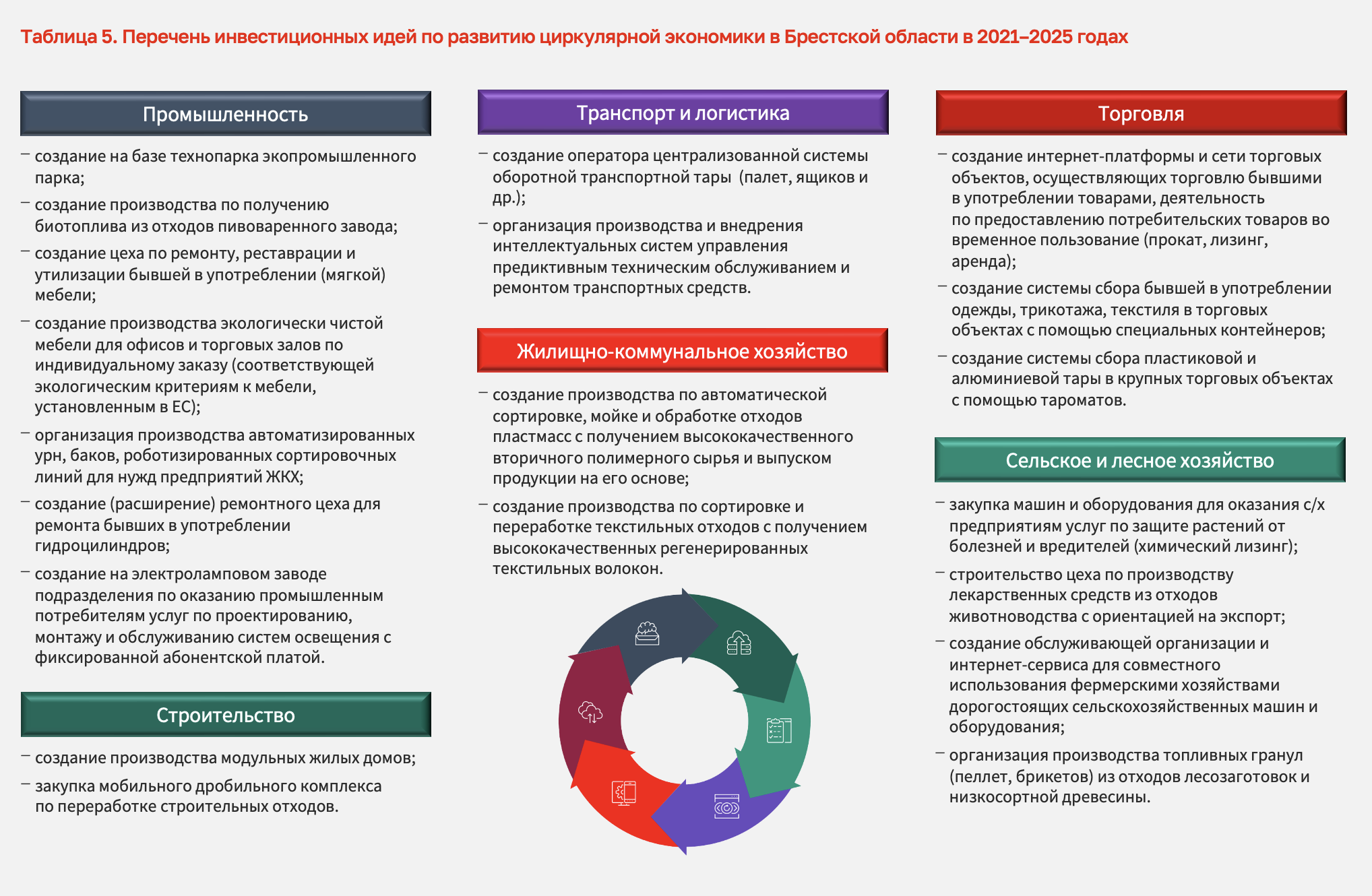 Помимо этого, в модельной программе представлены 29 инвестиционных идей по развитию циркулярной экономики в важнейших секторах экономики Брестской области: сфере промышленности, строительства, транспорта, торговли, сельского и лесного хозяйства, жилищно-коммунального хозяйства (Таблица 5). Указаны их потенциальные исполнители (конкретные организации Брестской области).
