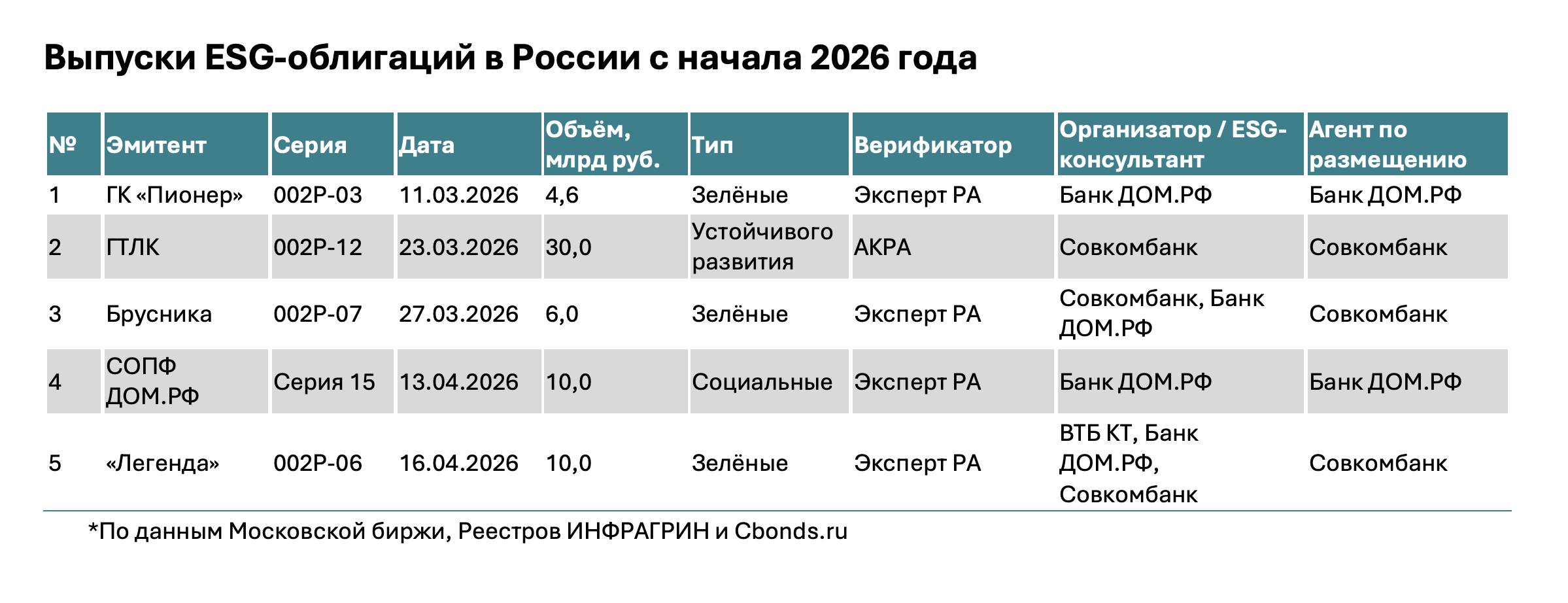 Совокупный объём пяти выпусков составил 60,6 млрд рублей, из которых 40,6 млрд пришлось на первый квартал, ещё 20 млрд — на первую половину апреля. Апрельский выпуск «Легенды» выделяется нетипичной для зелёных облигаций структурой: размещение прошло по дисконтной схеме, цена составила 60% от номинала, а основной доход инвестора формируется за счёт разницы между ценой покупки и погашения.