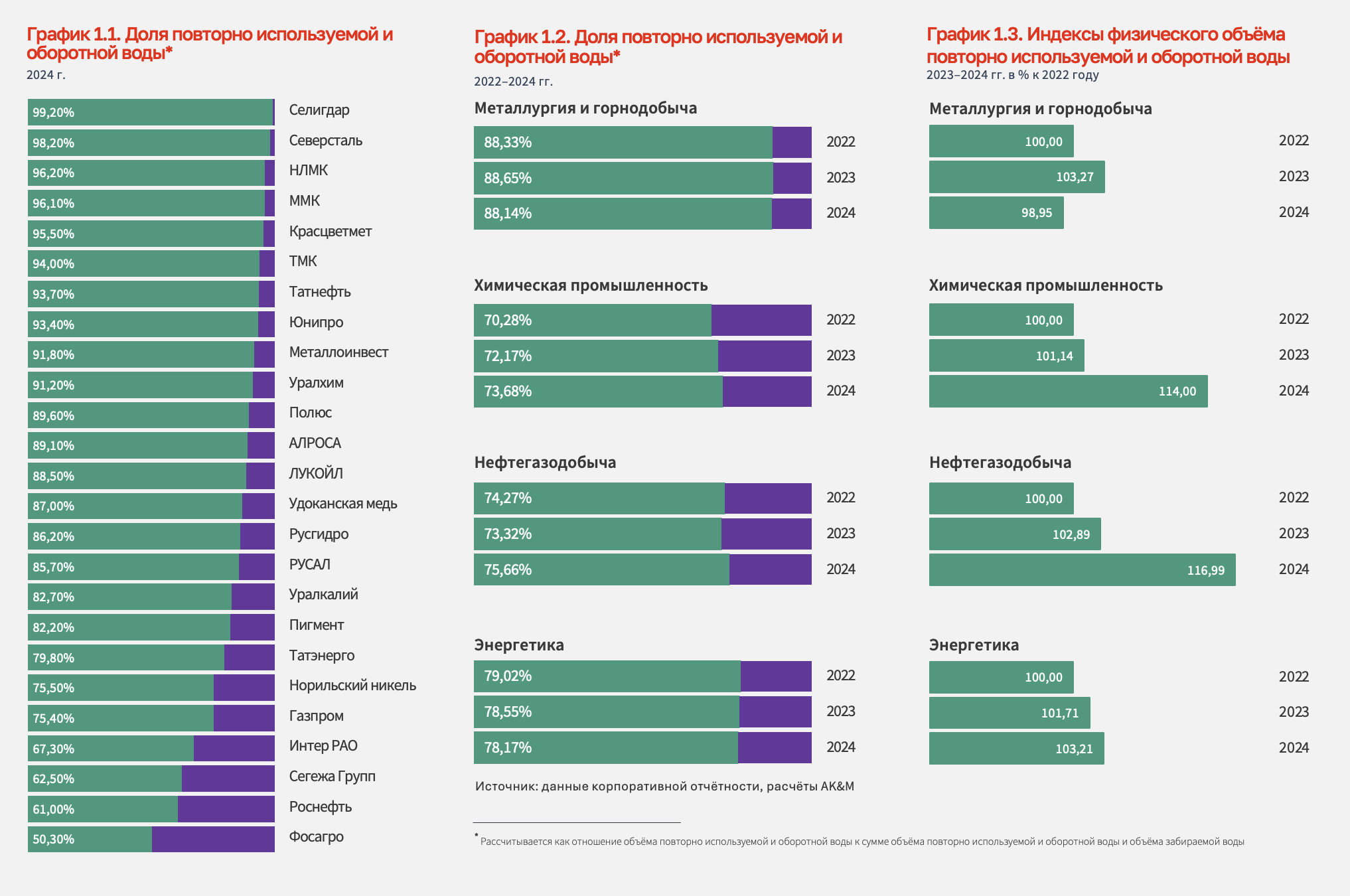 Лидерами по уровню повторного использования воды в 2024 году были «Селигдар», «Северсталь», НЛМК. В «Селигдаре» в замкнутой системе вода после технологического процесса подаётся в сгуститель и в корпус фильтрации, откуда затем осветлённая вода отводится в бак оборотной воды. Далее осветлённая вода из бака вновь подаётся на технологические процессы для повторного использования. Доля использования оборотной воды составляет 99,2%.