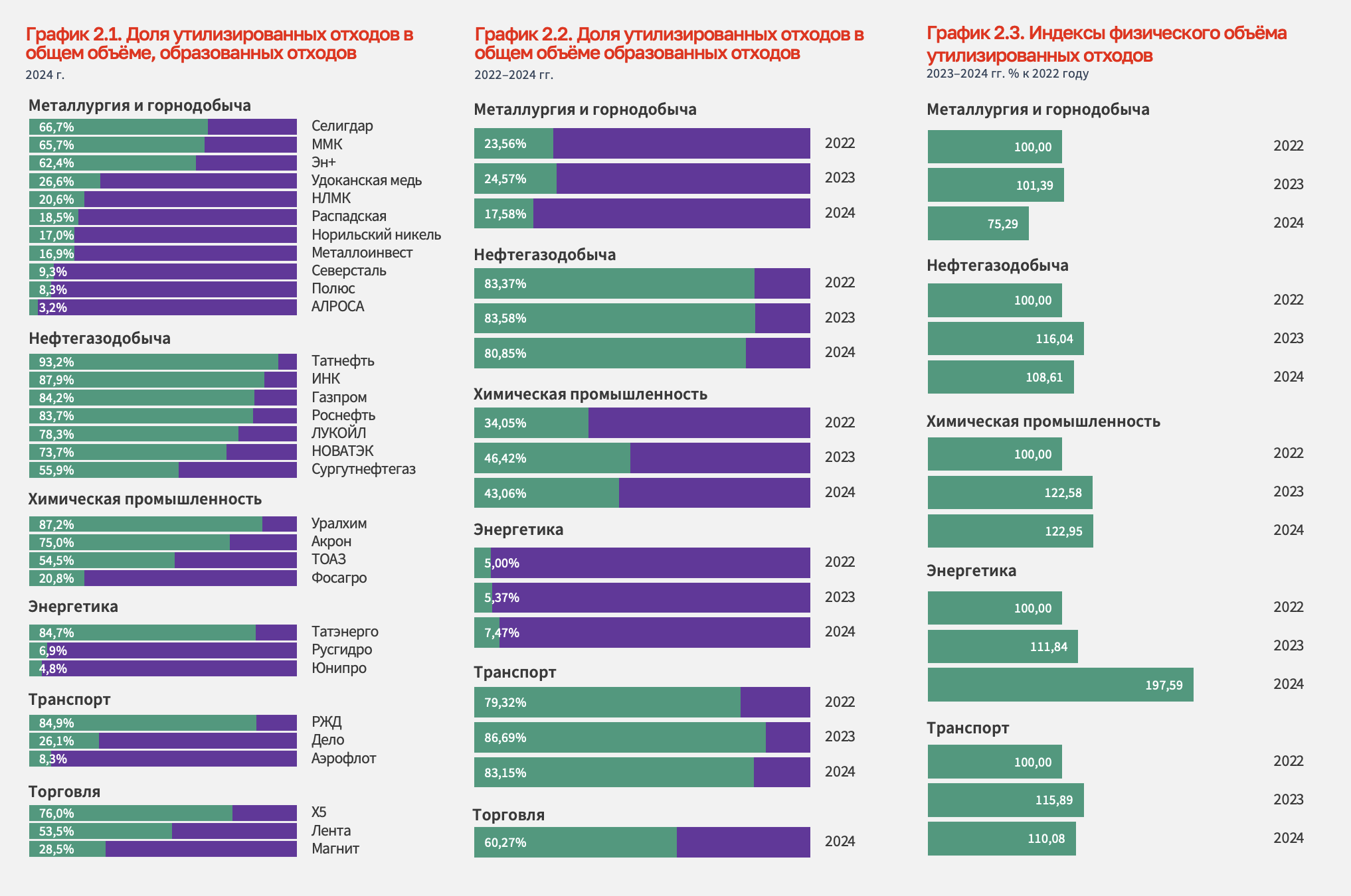 Рейтинговое агентство AK&M проанализировало данные об утилизации отходов крупнейшими компаниями за последние три года. Источником информации были данные, опубликованные в официальной отчётности (Графики 2.1 – 2.3).